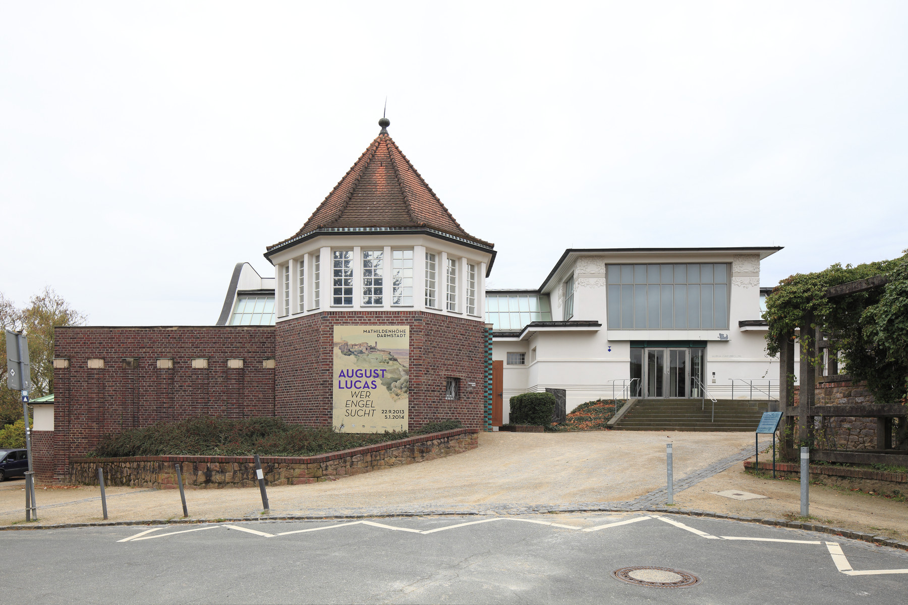 For the second exhibition of the artists' colony at the Mathildenhöhe in 1904, Joseph Maria Olbrich designed an octagonal extension with connecting wing for the Studio Building erected in 1901. As a structural extension, it provided workspace for two sculptors, each with a separate entrance, as well as a small studio in the octagon. Clearly visible are the rows of skylights for the lighting of the workspaces. In front of the two studios in the east is the sculpture courtyard, surrounded by masonry with clinker pilaster strips and light-coloured plaster surfaces.