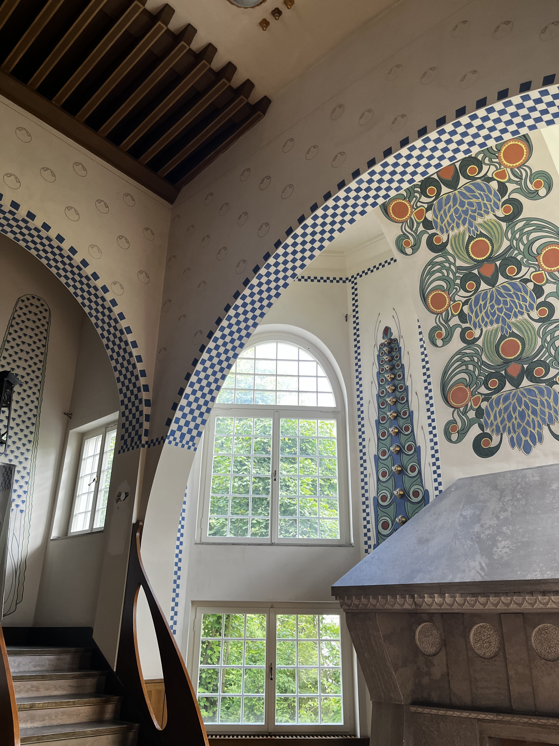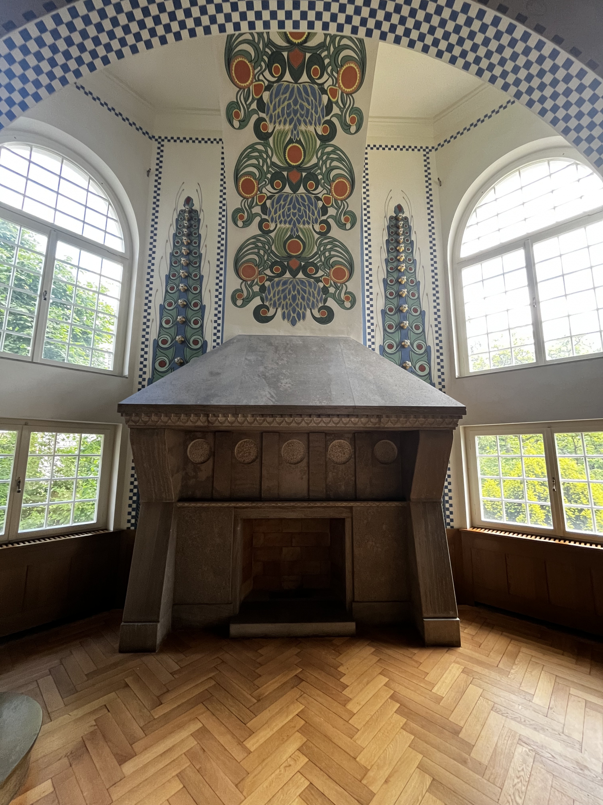 Glückert changed the design of the interiors several times. The final changes were made in the great hall for the 1908 exhibition. Parts of this interior are now on display in the Artists’ Colony Museum.